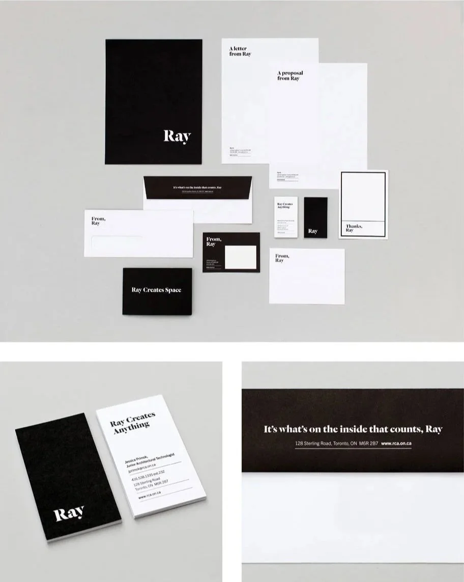 The new name “Ray” honours the company’s history while signaling intimate, first-name-basis relationships. Simple identity design with premium materials—duplex letterpress business cards and soft-touch mailers—reinforces their attention to detail.